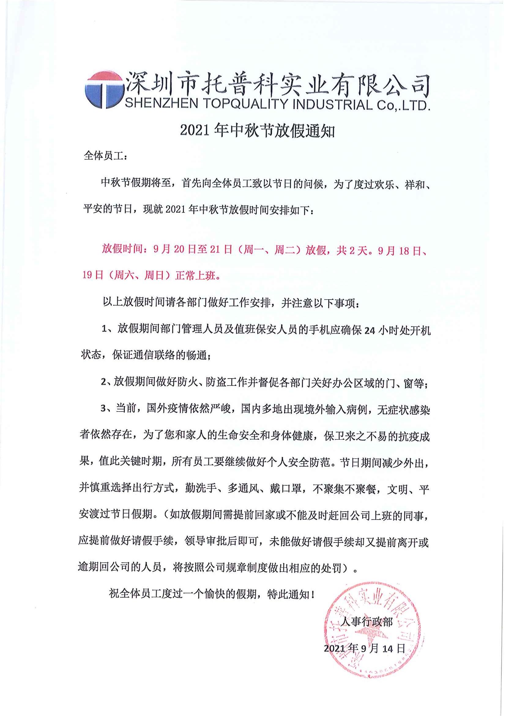 托普科中秋節(jié)放假通知