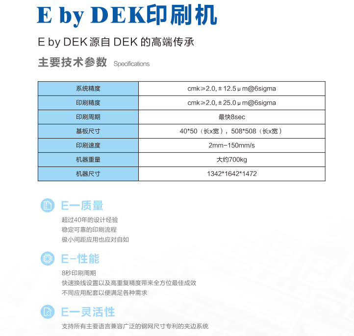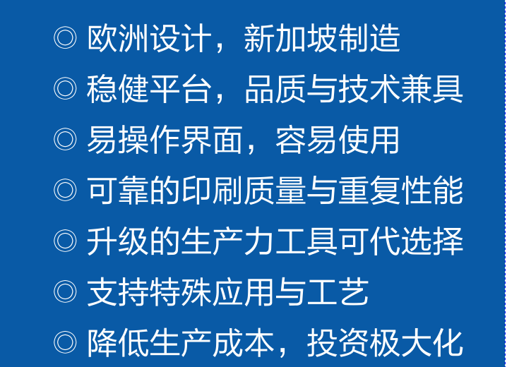Eby DEK印刷機,歐洲設計,新加坡制造。穩健平臺,品質與技術兼具,易操作界面和容易使用??煽康挠∷①|量與重復性能。