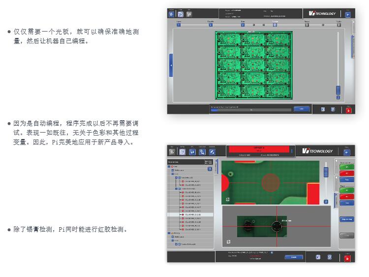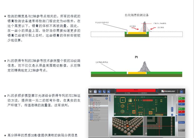 VI 3D錫膏檢測設(shè)備 PI Series 1. 自動編程可用于新產(chǎn)品的檢測 2. 除錫膏檢測外PIE也可進(jìn)行固定膠檢測 3. 通過面積區(qū)域比率可實現(xiàn)自動分焊盤 4. 3D超大圖像檢查更便于使問題判斷 5. 通過SIGMA分析技術(shù),離線SPC,嵌入式 SPC 實現(xiàn)實時程序監(jiān)控
